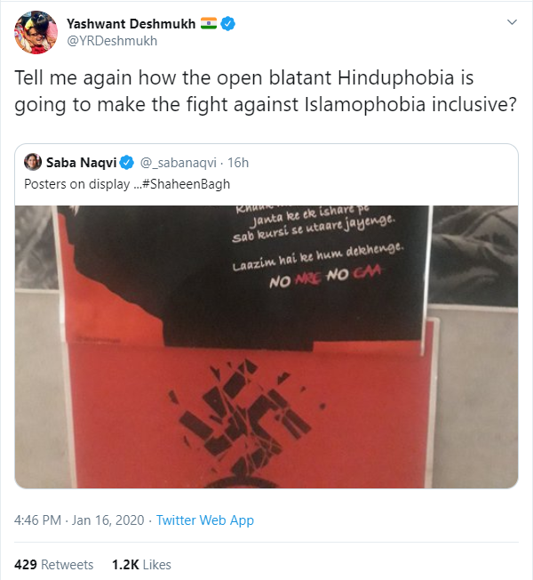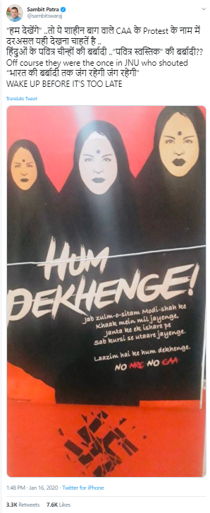 BJP spokesperson Sambit Patra tweeted an anti-Citizenship Amendment Act (CAA) poster and claimed that it disrespects the Hindu symbol ‘Swastika’. “Hum dekhenge…so this is what the protestors in Shaheen Bagh want to show in the name of CAA protests. Destruction of holy symbols of Hindus. “Destruction of the holy Swastika”?? Off course they were the once in JNU who shouted, “There will be war till India is destroyed.” Wake up before it’s too late,” he tweeted. Patra’s tweet drew over 7,000 likes and more than 3,000 retweets in less than two hours. [Translated from “हम देखेंगे” ..तो ये शाहीन बाग वाले CAA के Protest के नाम में दरअसल यही देखना चाहतें है .. हिंदुओं के पवित्र चीन्हों की बर्बादी ..”पवित्र स्वस्तिक” की बर्बादी?? Off course they were the once in JNU who shouted “भारत की बर्बादी तक जंग रहेगी जंग रहेगी” WAKE UP BEFORE IT’S TOO LATE]