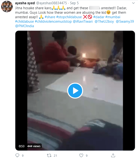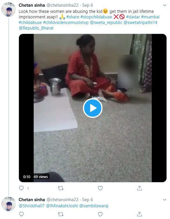 A video of a woman beating and abusing a toddler has taken social media by the storm. Users are claiming that the video is from Mumbai’s Dadar area. It shows the woman pouring hot candle wax on the baby. The video is being circulated with appeals to share it widely along with demands for the woman’s arrest. On September 5, a Twitter user shared the clip tagging the handle of the Prime Minister’s Office.