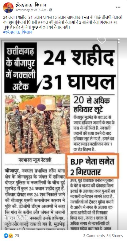 The image of soldiers carrying a coffin is captioned, ‘भारत न्यूज़ नेटवर्क’. We searched for the e-paper and found the news on epaper.enavabharat.com published on April 5, 2020. The front page of this e-paper carries the news with the same layout as the viral clipping. But the original does not report that a BJP leader was booked for Naxal connection. The report is on the recent Bijapur attack. The sub-heading in the original report reads, “2,059 jawans were looking for Hidma.” Maoist leader Madvi Hidma has emerged as the mastermind of the massacre of 22 security personnel.