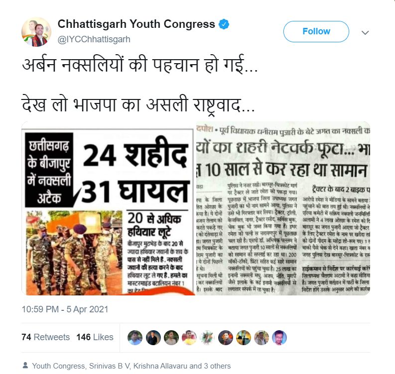 A deadly Maoist attack in Bijapur, Chhattisgarh on April 2 left 22 soldiers martyred and 31 injured. In the backdrop of this, Chhattisgarh Youth Congress tweeted two newspaper clippings and wrote, “It is now evident who are urban Naxals… See BJP’s real nationalism.”